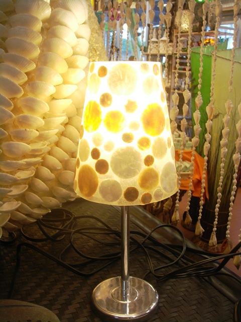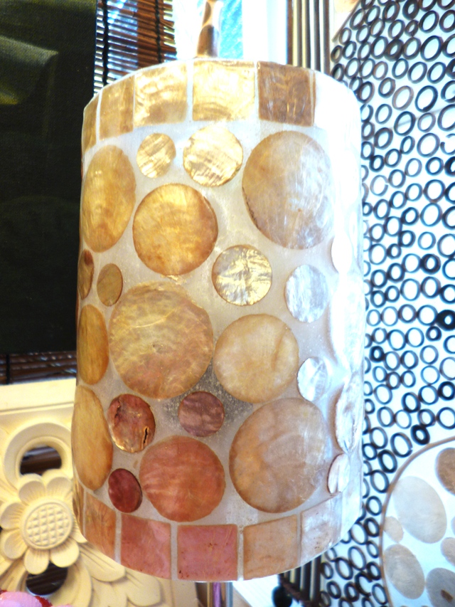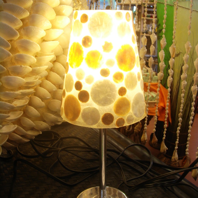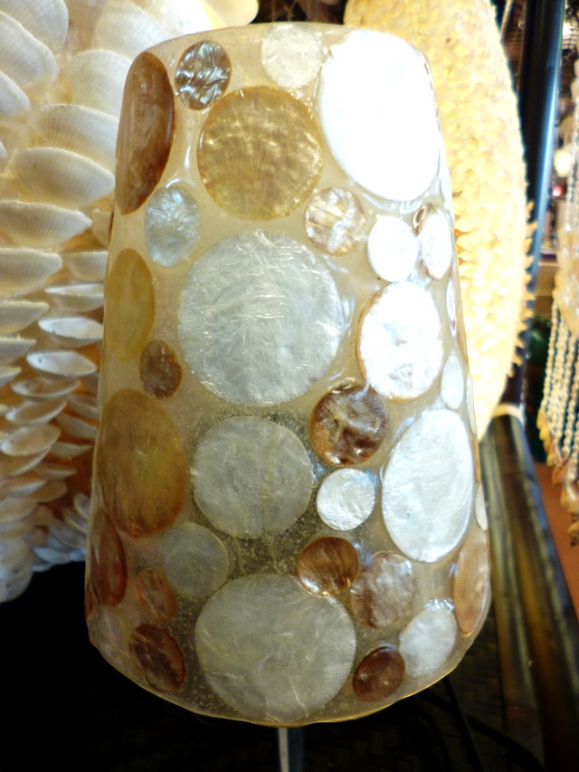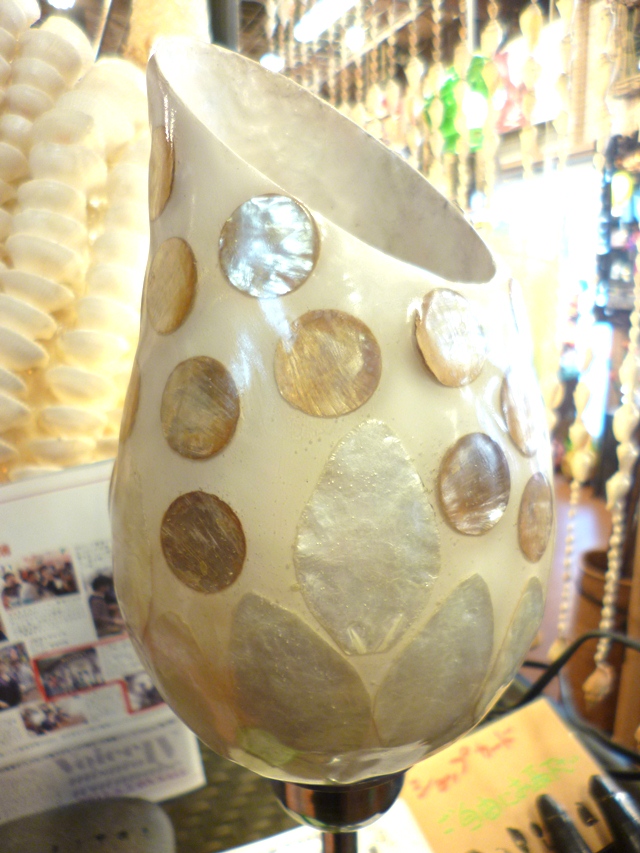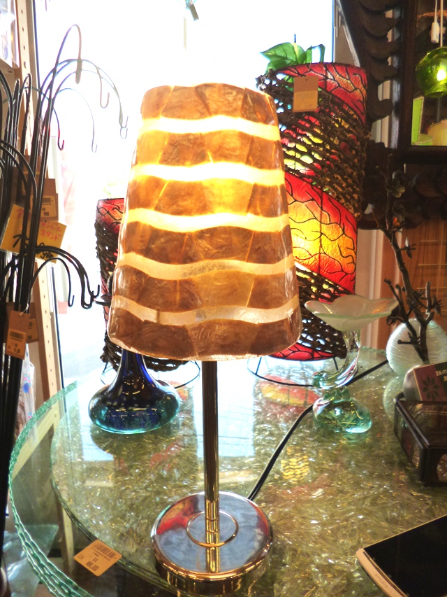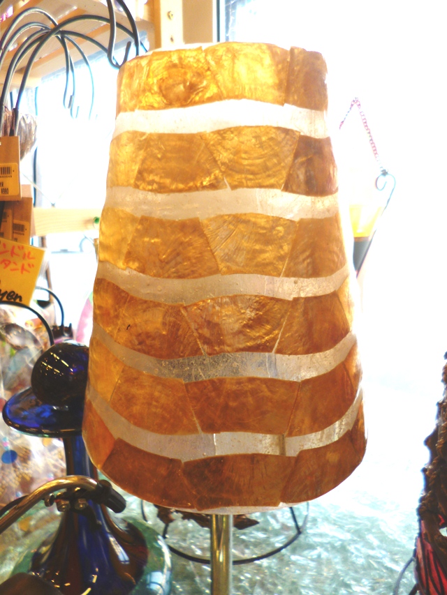 レジングラス(樹脂)にシェルを薄く切って貼りつけたランプです。