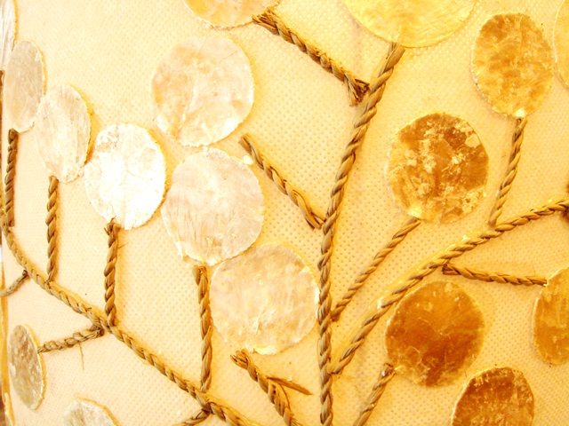 レジンの下地に布を張り、薄くスライスした貝殻を貼ってあります。