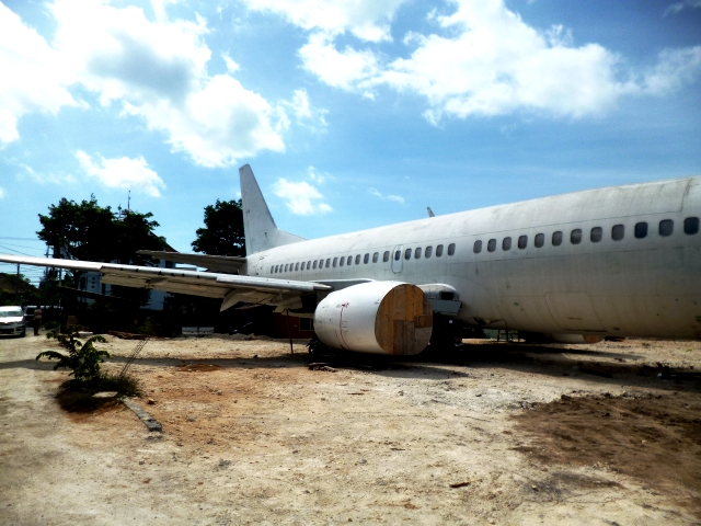 民家の門から飛行機が見えている!