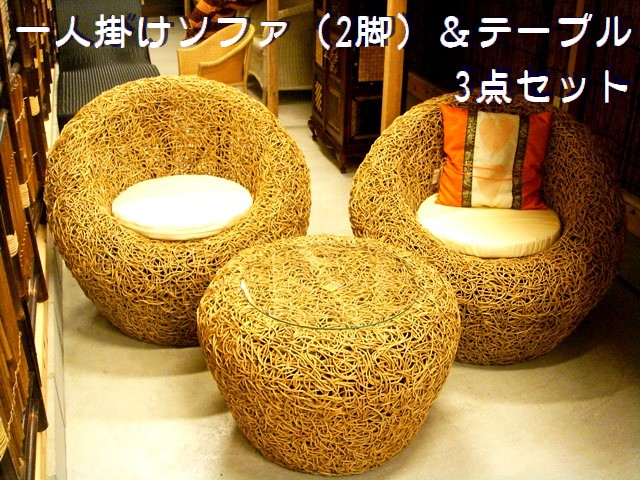 籐一人掛け用ソファ&サイドテーブル 3点セット