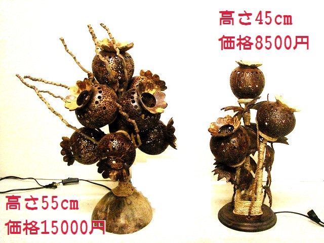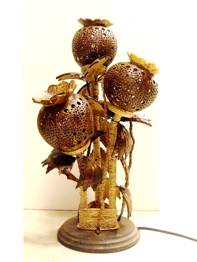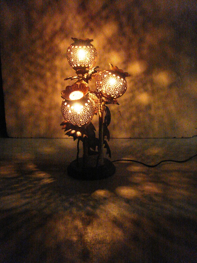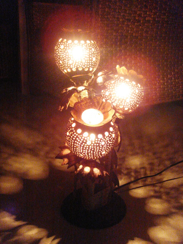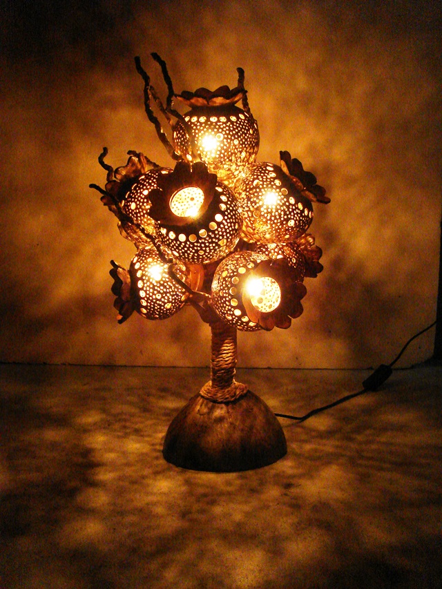 ココナッツの殻3個で作ったアジアンな卓上ランプ。