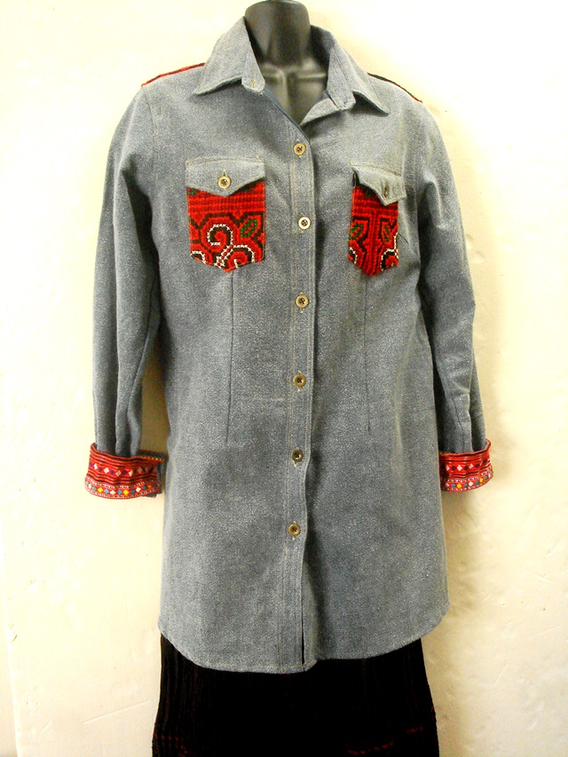 ヨークと胸ポケットにモン族刺繍布をパッチ。