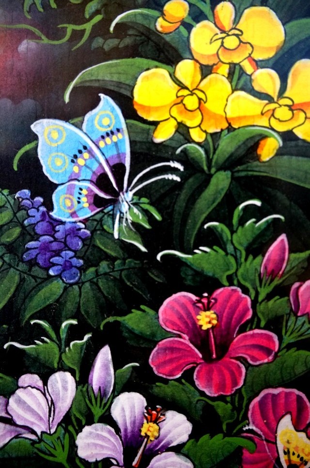 バリ絵画/花と鳥/額縁・ガラスつき