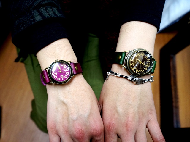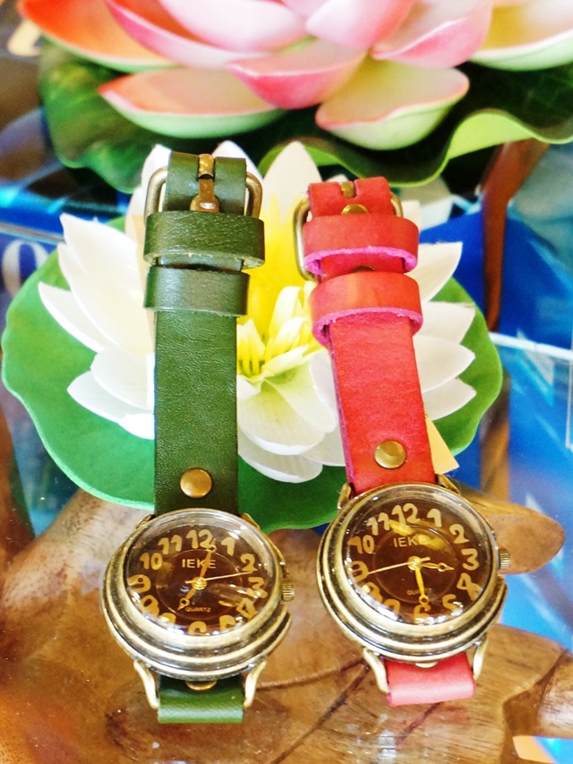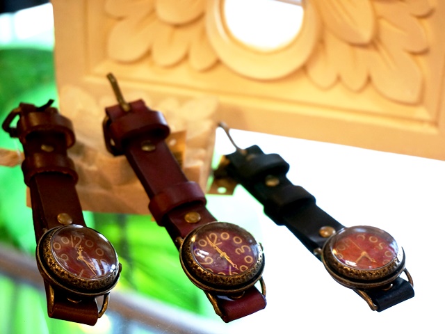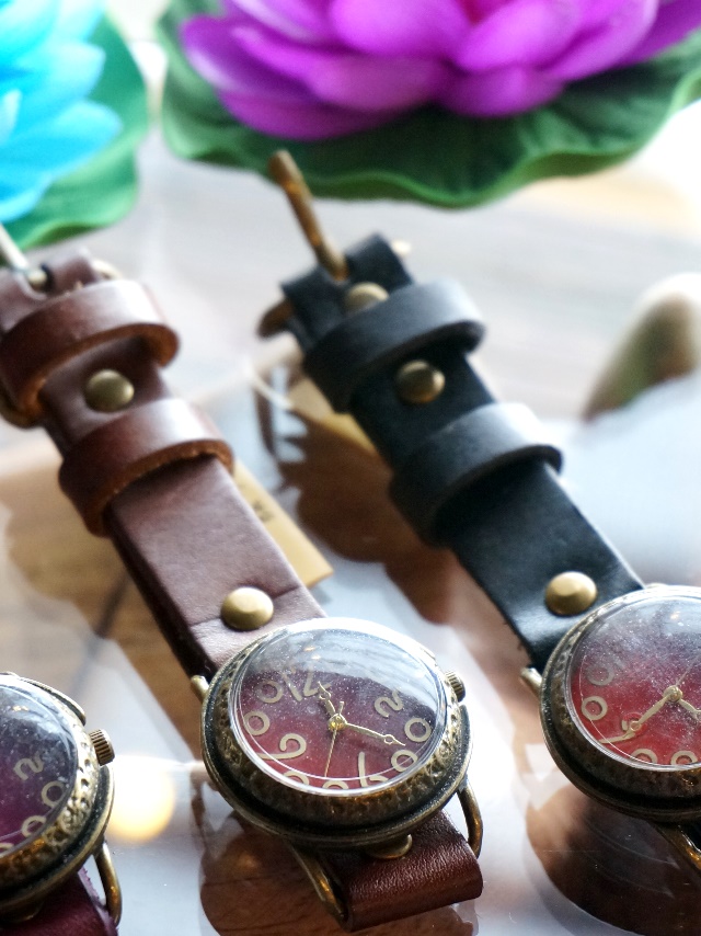 シンプルなレザーベルトの、レトロな感じの腕時計。