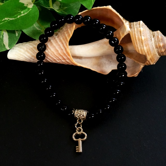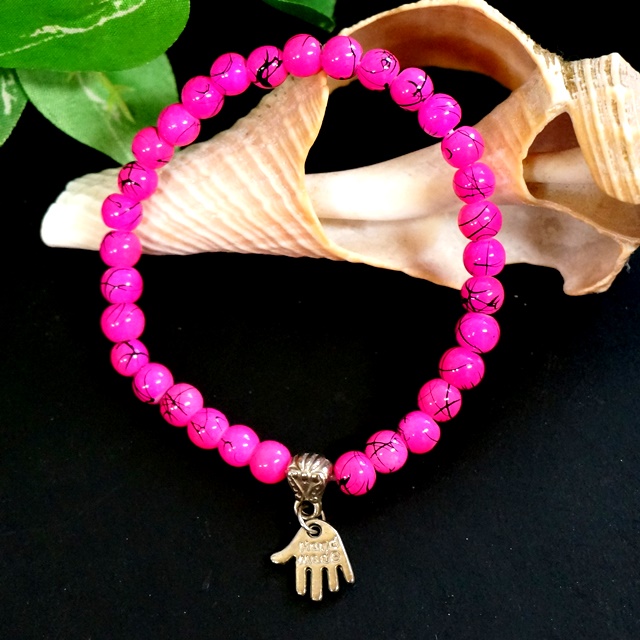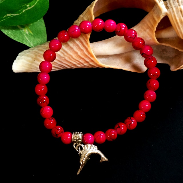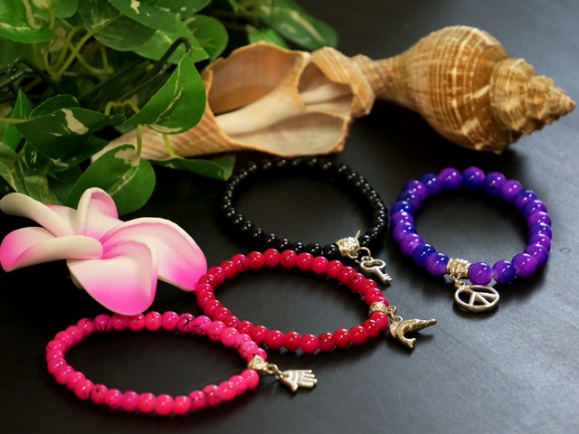 ビビッドカラーの樹脂製の丸ビーズに金属のチャーム。