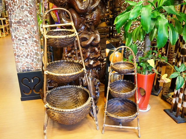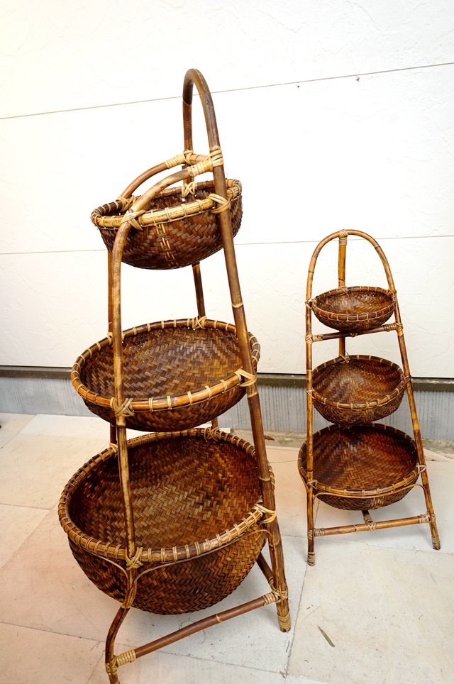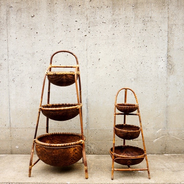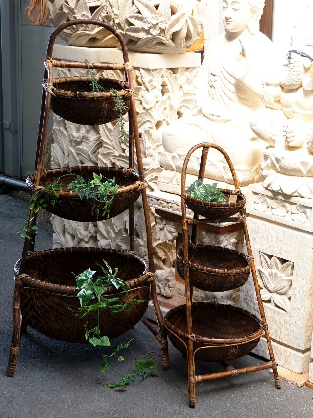 収納に、ディスプレイにと大活躍の3段スタンドのバンブー籠です。