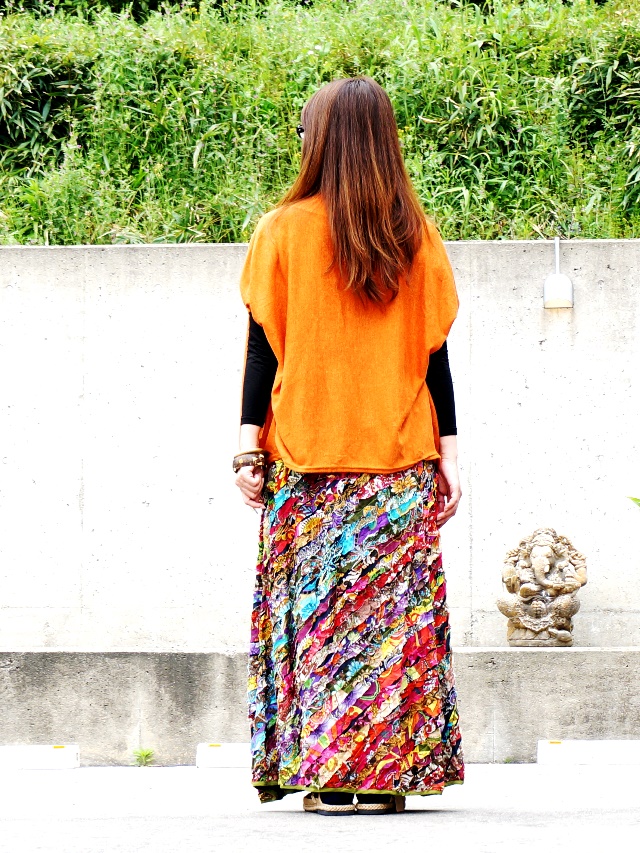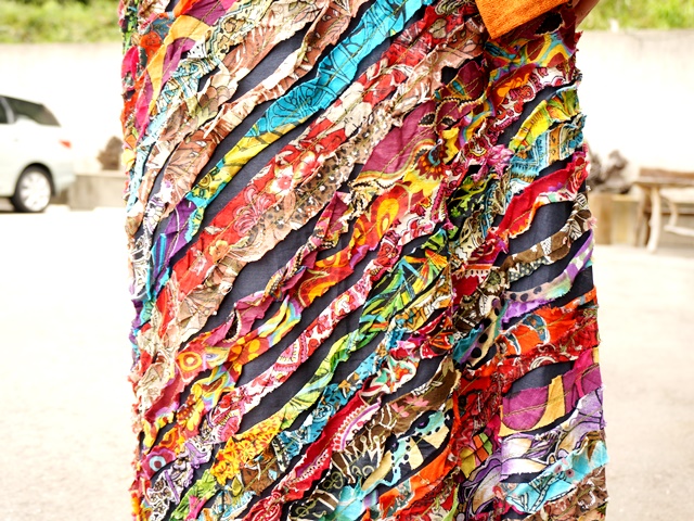 一緒にスタイリングしたスカートは、鮮やかなプリント布をリボンのように細くカットして