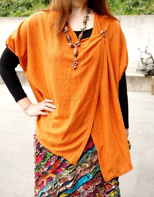 カシュクールのように着られて、付属のピンで好きななように留められるタイプの