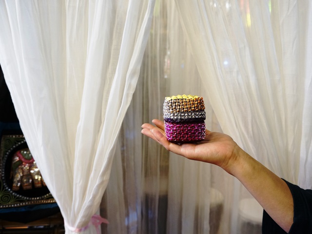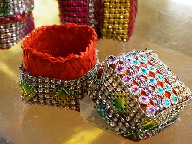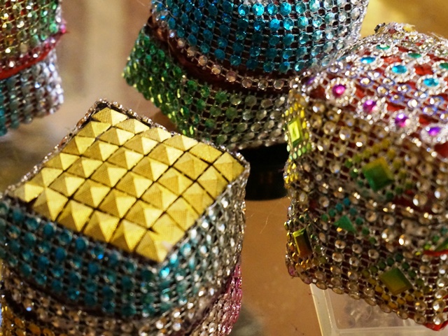 バンブーの小さな蓋付のボックスに、キラキラのスパンコールをびっしり縫い付けてあります。