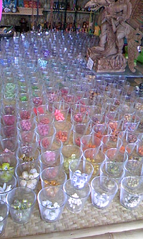 バリの木彫り、素焼き、お香 が大量入荷しました。 ガラスのコップには 400種類以上の手作りビーズのパーツです! 自分だけのアクセサリーを 作ってみてはいかがですか? 1グラム50円です よくお客様で3時間ぐらいビーズの前で 作って帰る方もいますよ