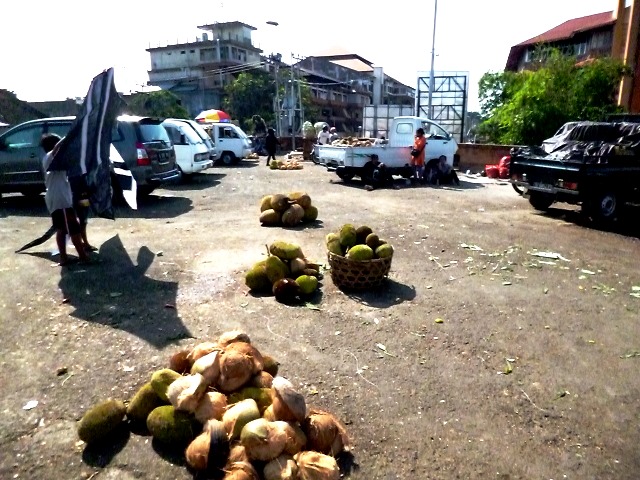 ちなみに、ここは市場の駐車場で、ドリアンを売っています。