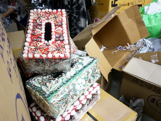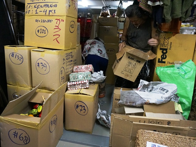 倉庫の中。奥の方まで箱が山積み。