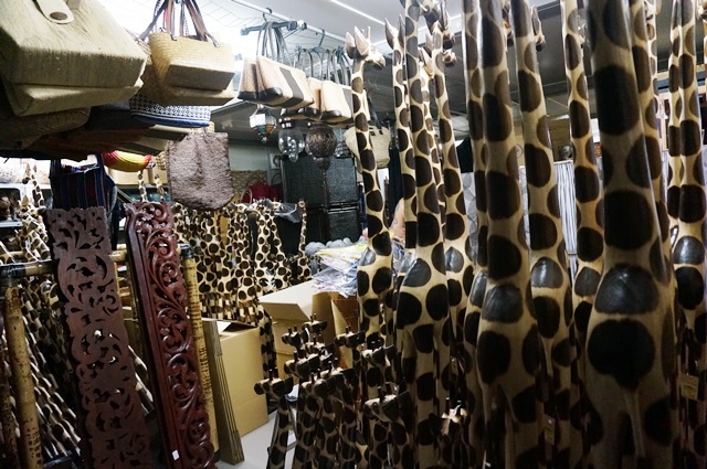 倉庫を埋め尽くす勢いの2メートルサイズの木彫りのキリンたち。