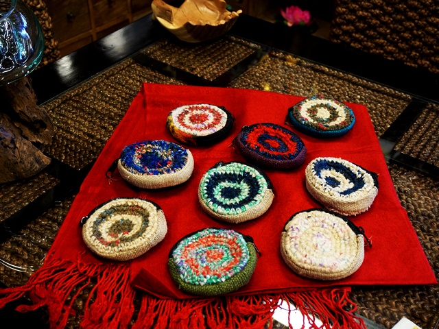 ぐるぐるのかぎ針編みに、ゲリコットンのマチがついていて、
