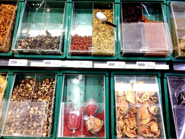 乾燥きのこや豆類の量り売りコーナー。