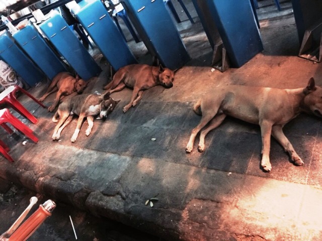 歩道で昼寝中の犬たち。