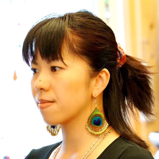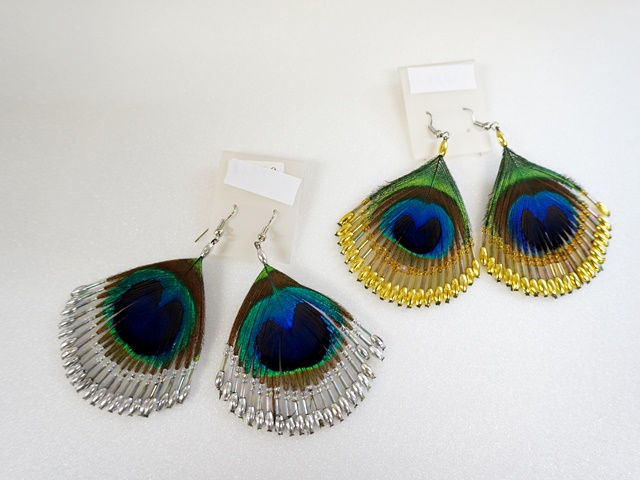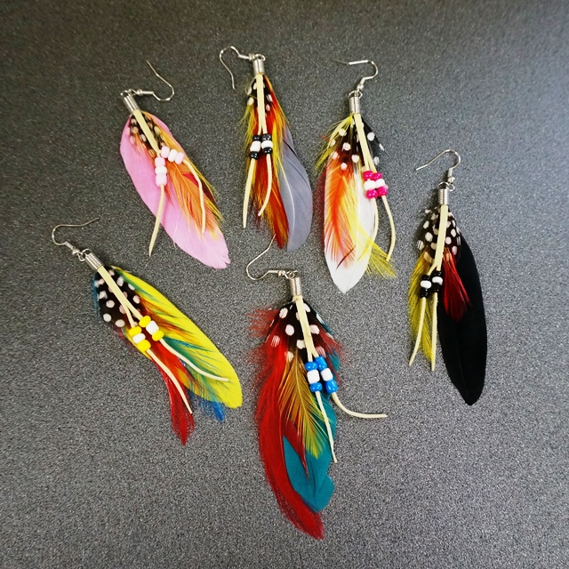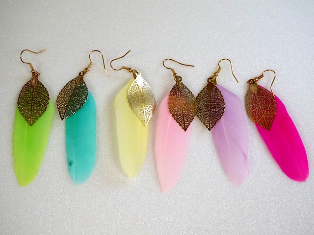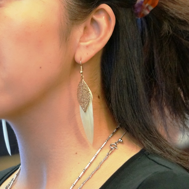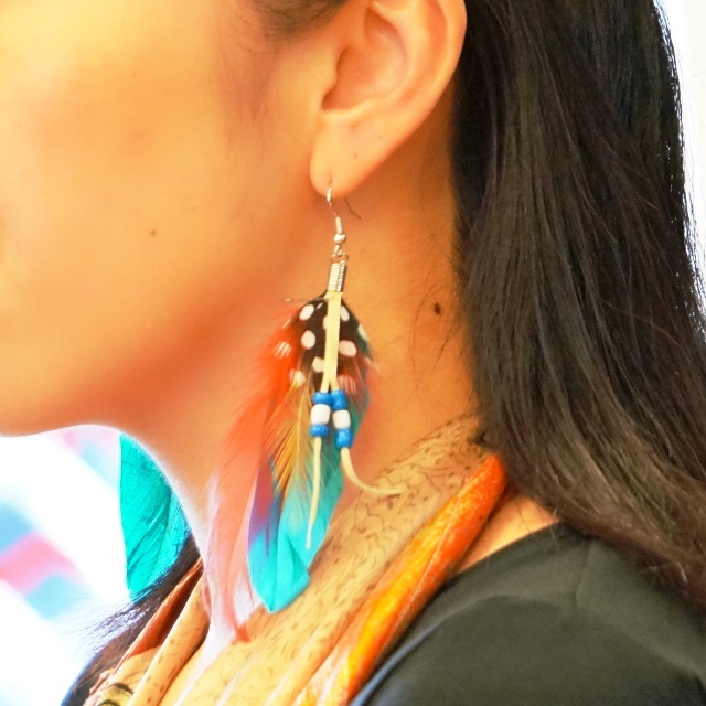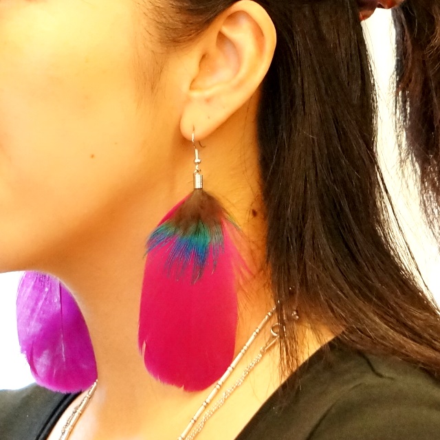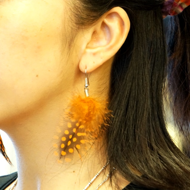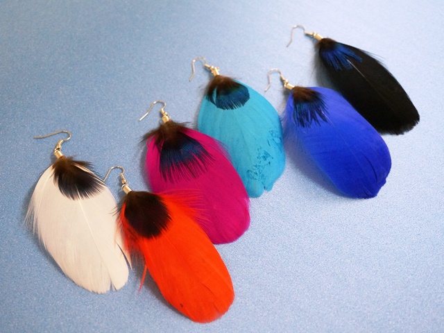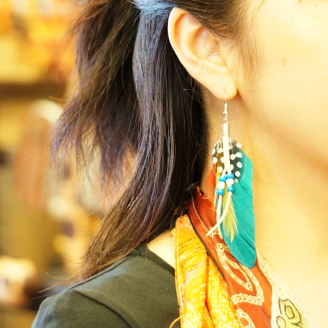 色鮮やかな羽ピアスは、顔周りを華やかに見せてくれます。