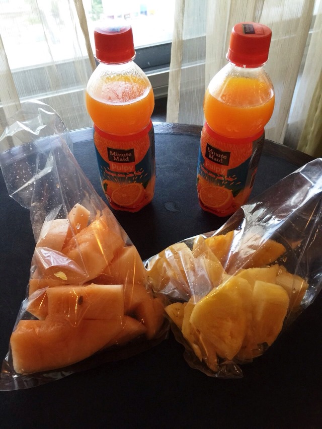 100%オレンジジュースを持って、まずはホテルへ。