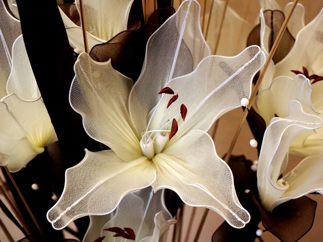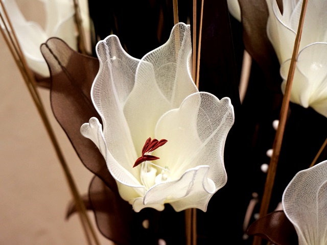 ワイヤーで作った花びらの骨格に、シフォン生地をかぶせてあります。