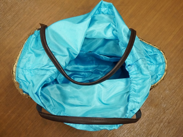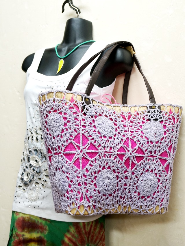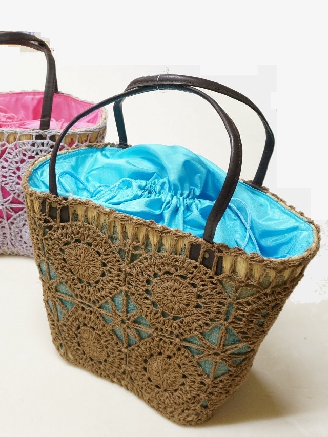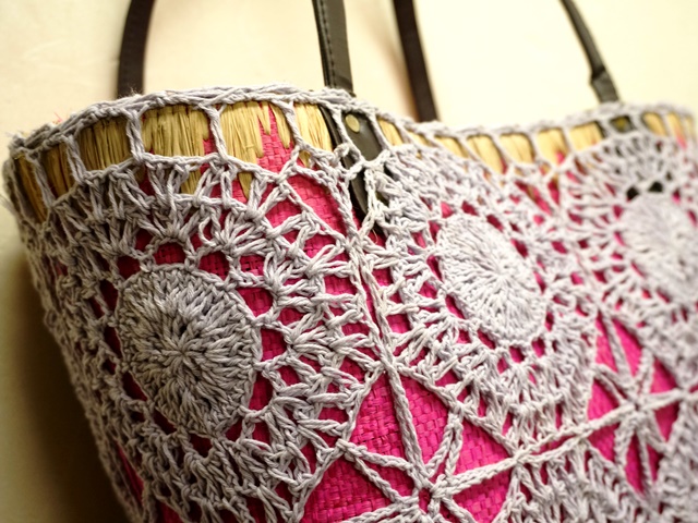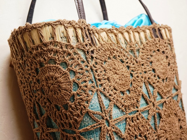 い草のカゴバッグに、クロッシェレースをかぶせた