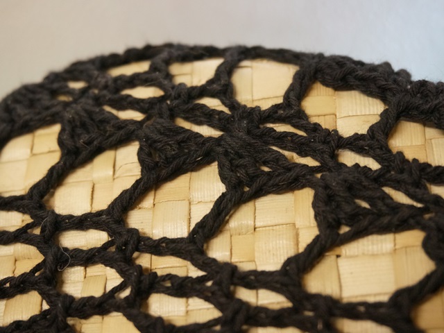 テープ状の竹を編んでかごにし、コットン糸のクロッシェレースをkぶせてあります。