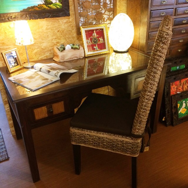 希少なチーク材にバンブーで装飾したデスク、天板はガラスです。