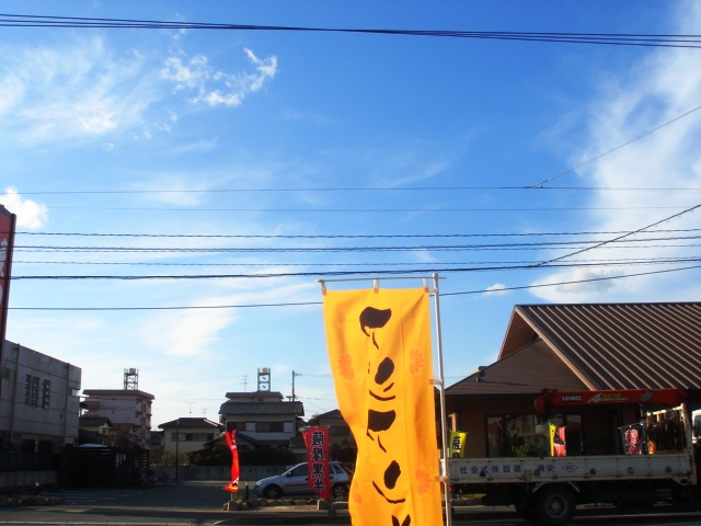 朝、店の前にのぼりを立てている時、あんまり空がキレイなので写真を撮ってみました。