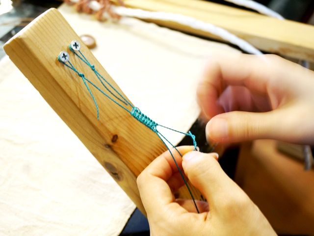 マクラメとは、ひもを結び込んだり、編みこんでいくことで