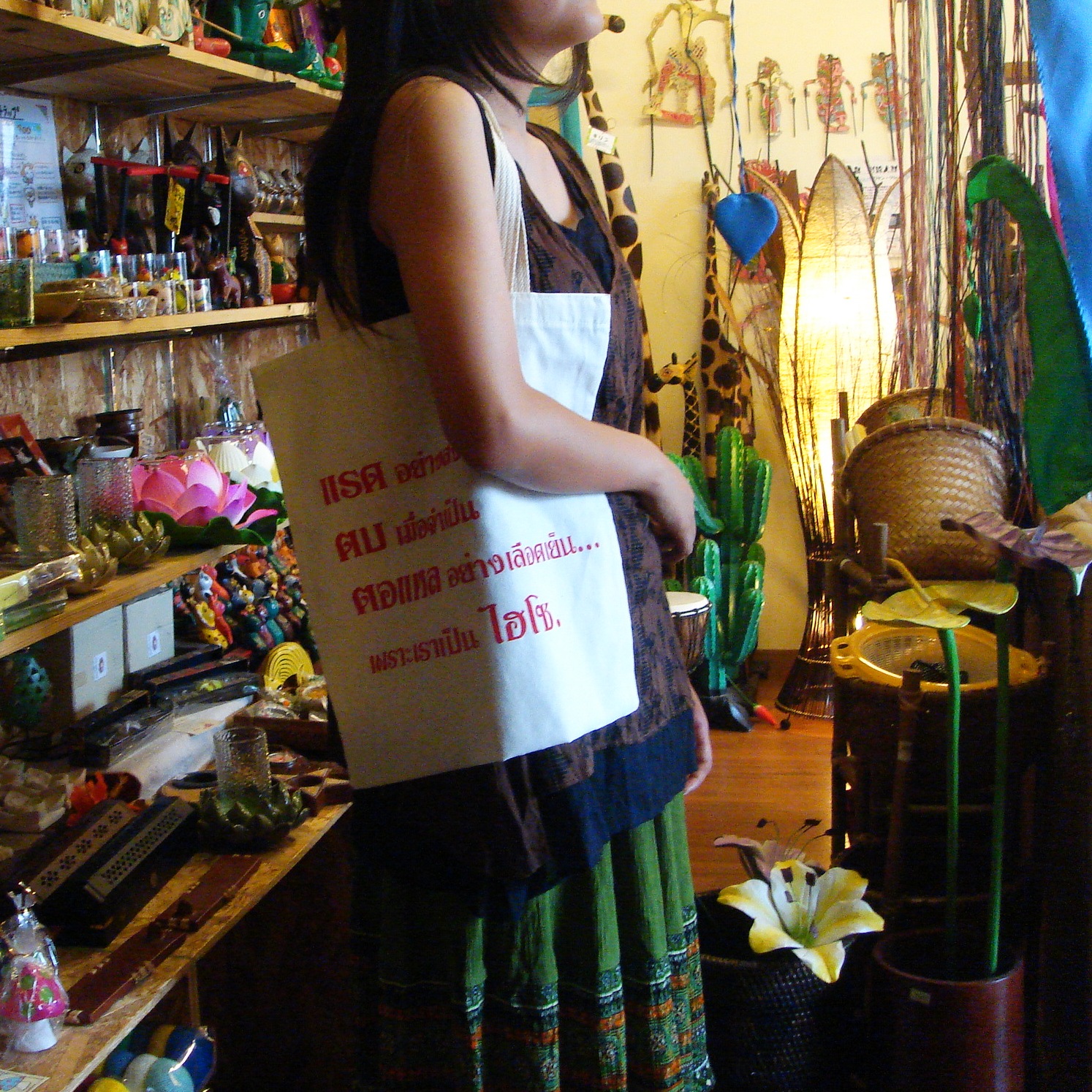 タイ文字をプリントした、コットン100パーセントのエコバッグ。