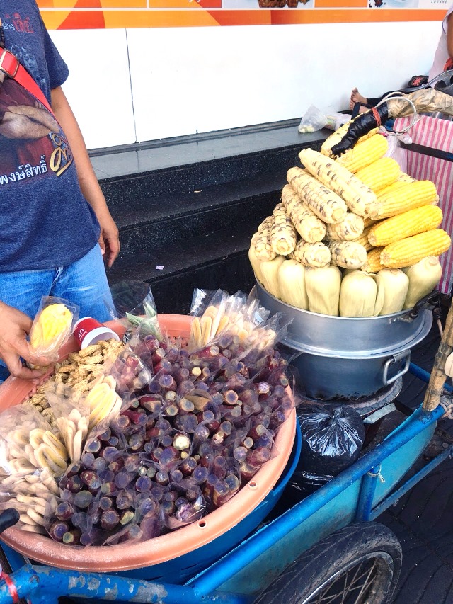 蒸したトウモロコシと紫いも 30バーツ(約96円)