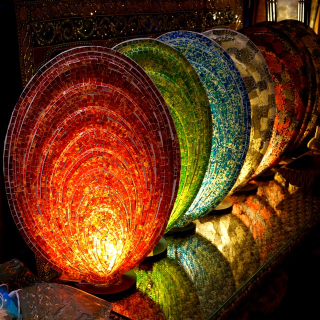 ガラスのモザイクをいっぱい貼りつけた、シェルの形のランプ。 各25,000円。