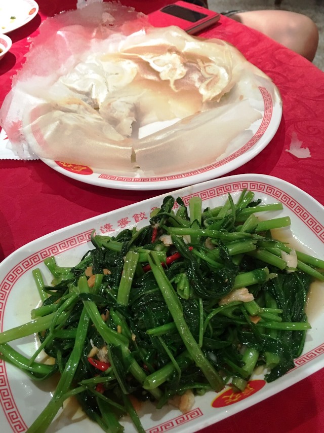 いつも頼む羽根つき餃子と、空芯菜の炒め物。
