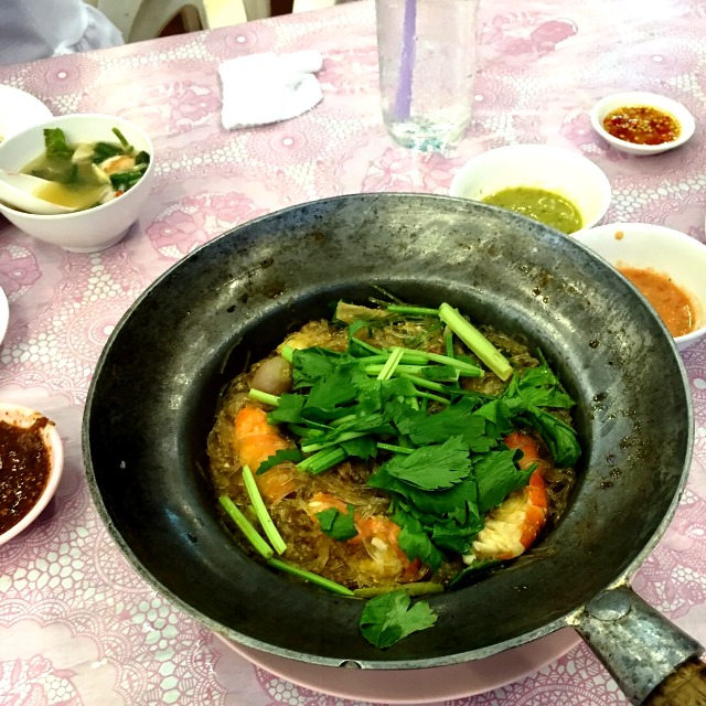 ソムタムは、通訳に任せて、豚の炒め物と春雨の海老煮込みのみ