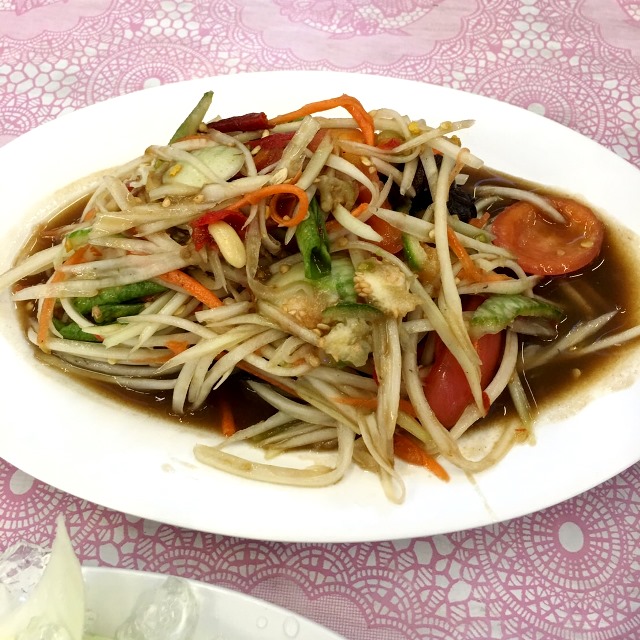 もやしのように見えるが、ソムタムという、青パパイヤのサラダ。