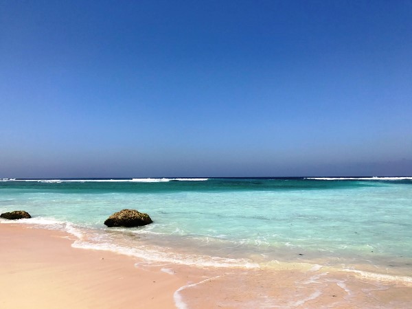 海は抜群の透明度、白い砂浜、穏やかな波。