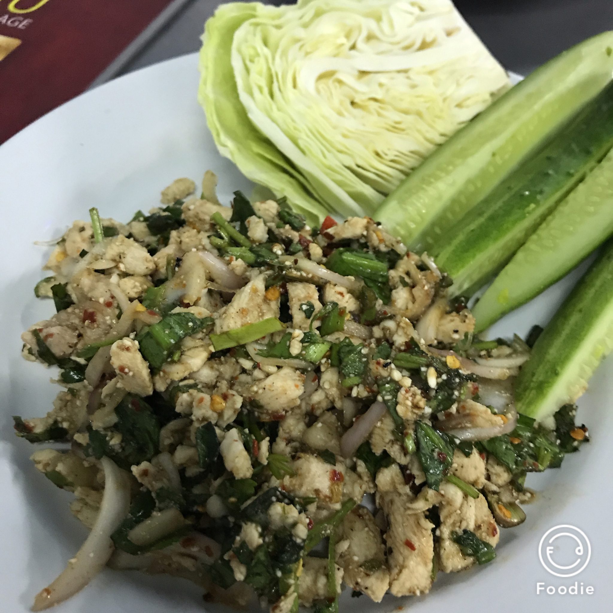 火を通した鶏肉に玉ねぎ、ハーブ、ナンプラー、唐辛子、ライム炒り米粉などを混ぜ合わせたサラダ。ハーブが効いていて、パンチのある辛味がまたクセになります。ビールが進みます(笑)
