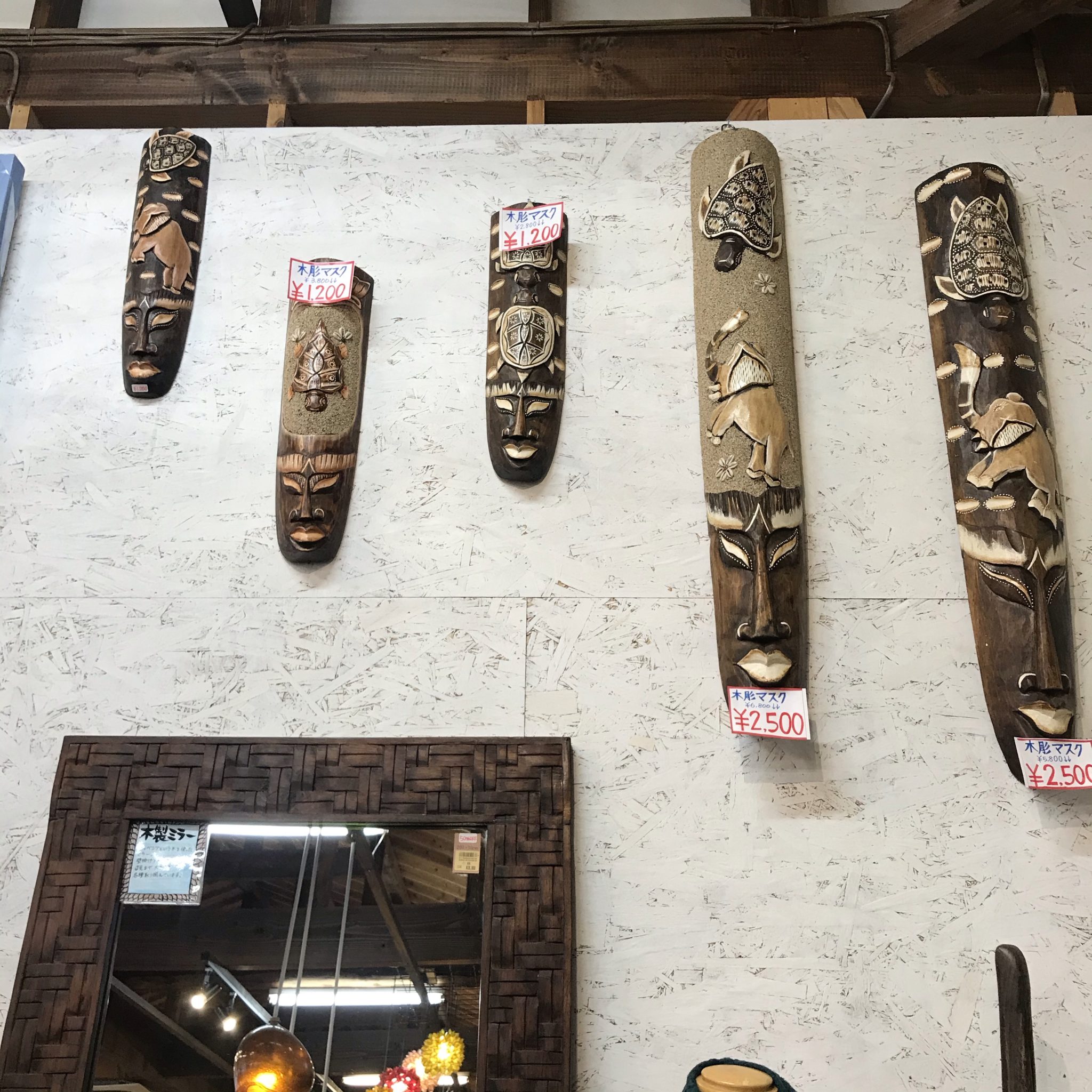 人気のバリ島のプリミティブな仮面、マンションの白い壁にも映えます。