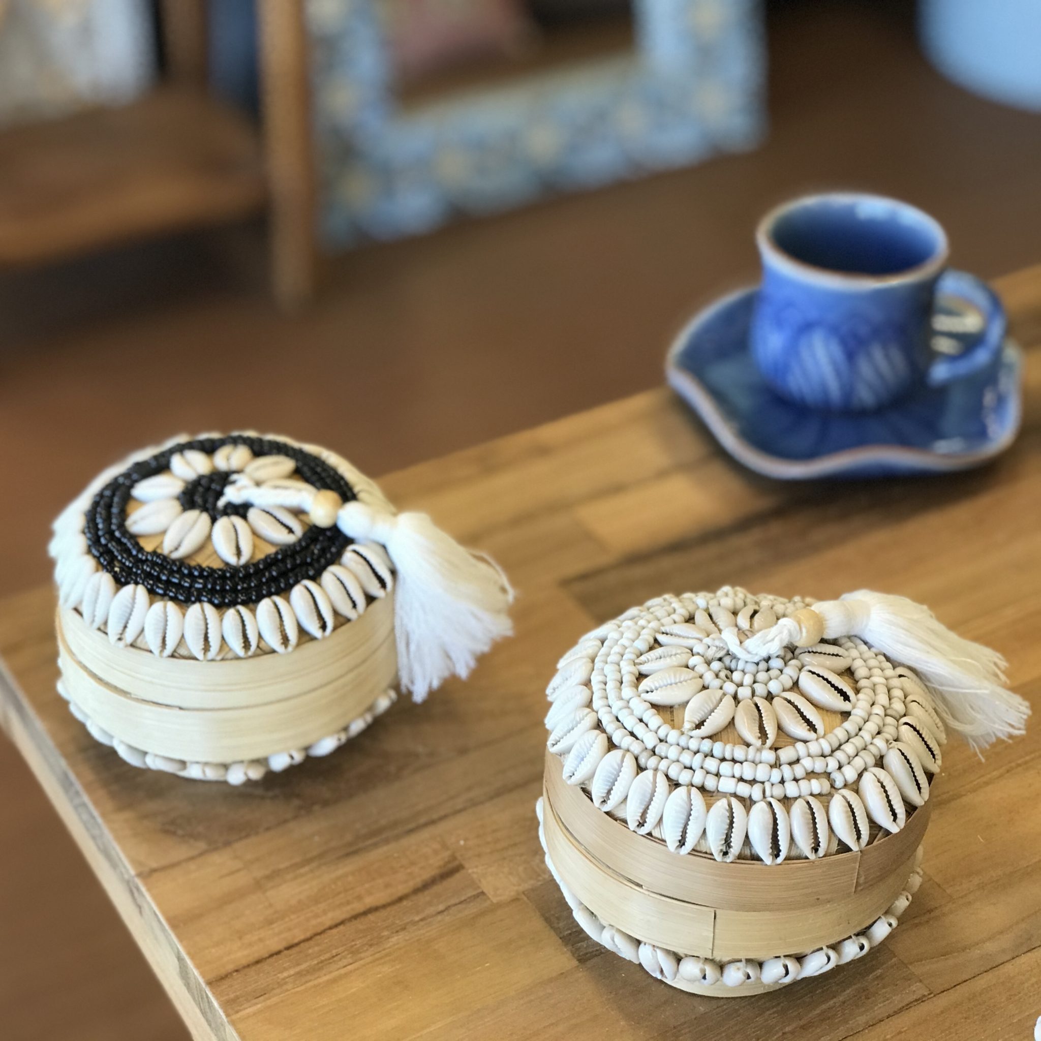 デスクやテーブル・棚などに、アクセントにもなる小さな蓋つき小物入れ。