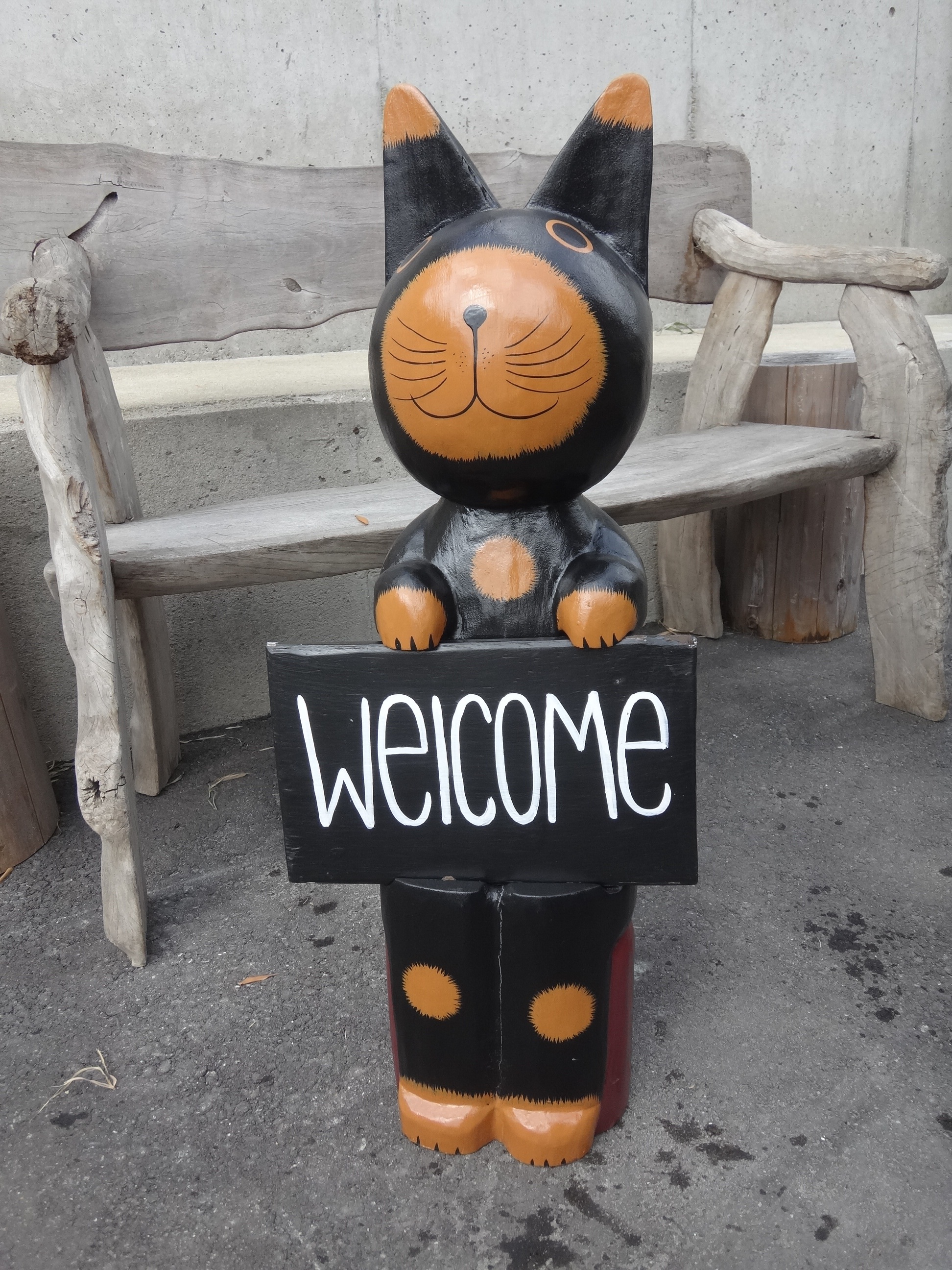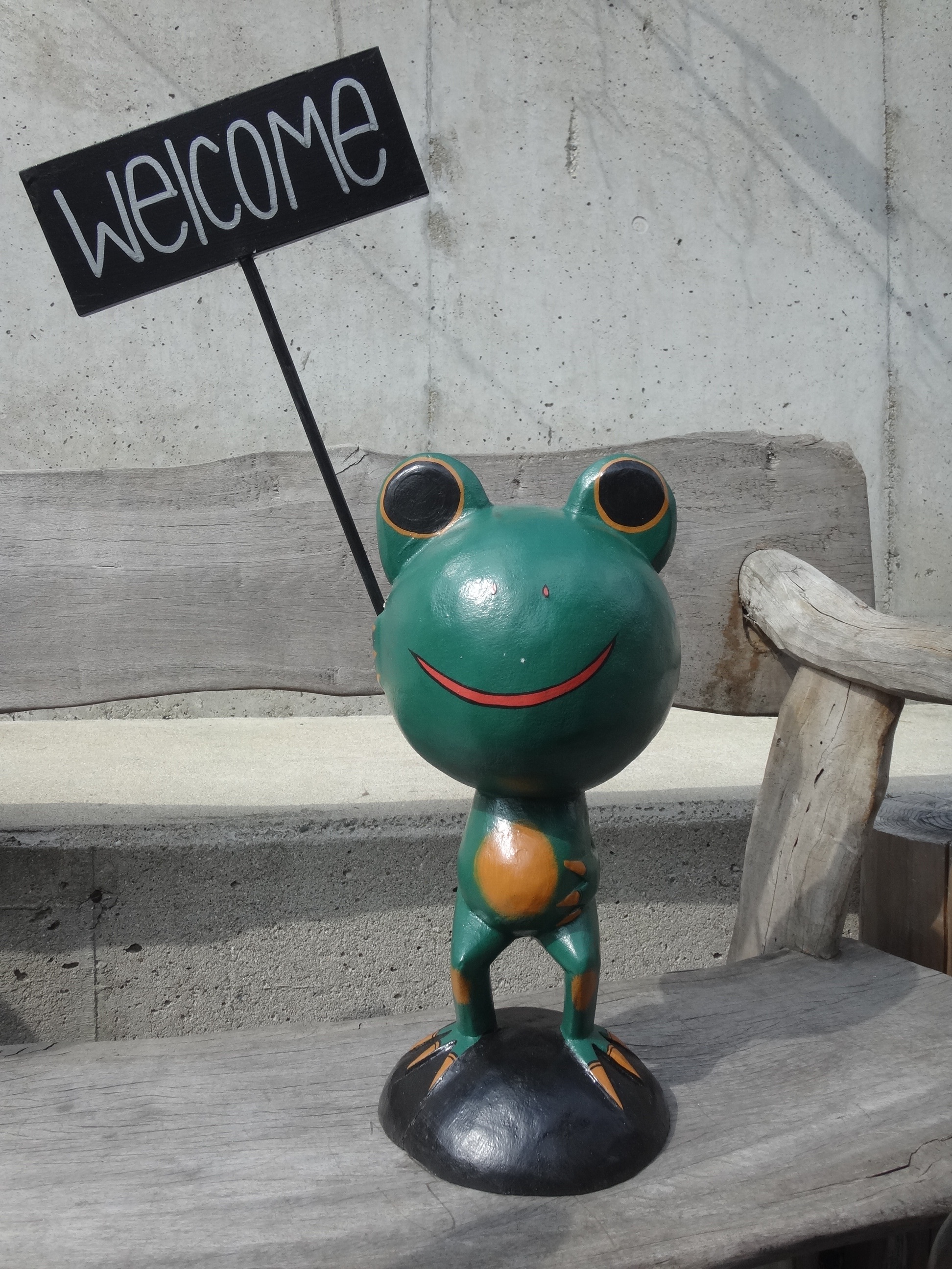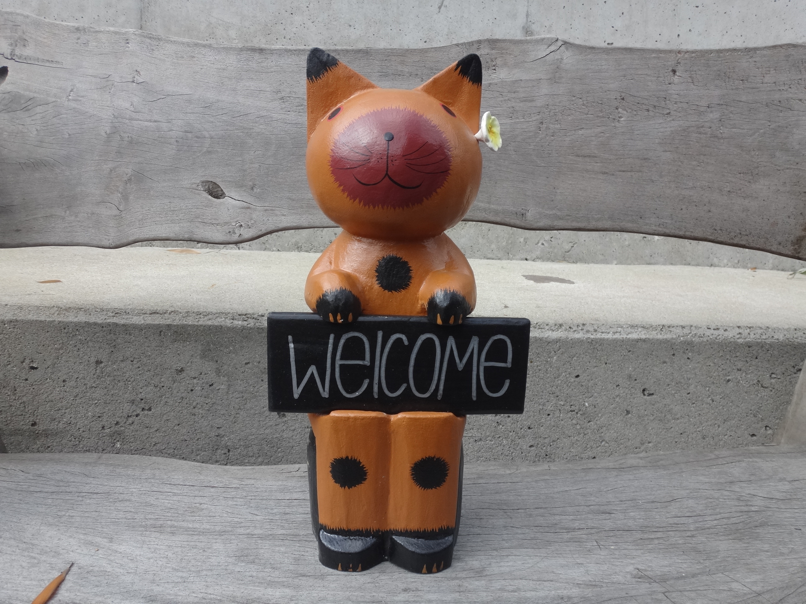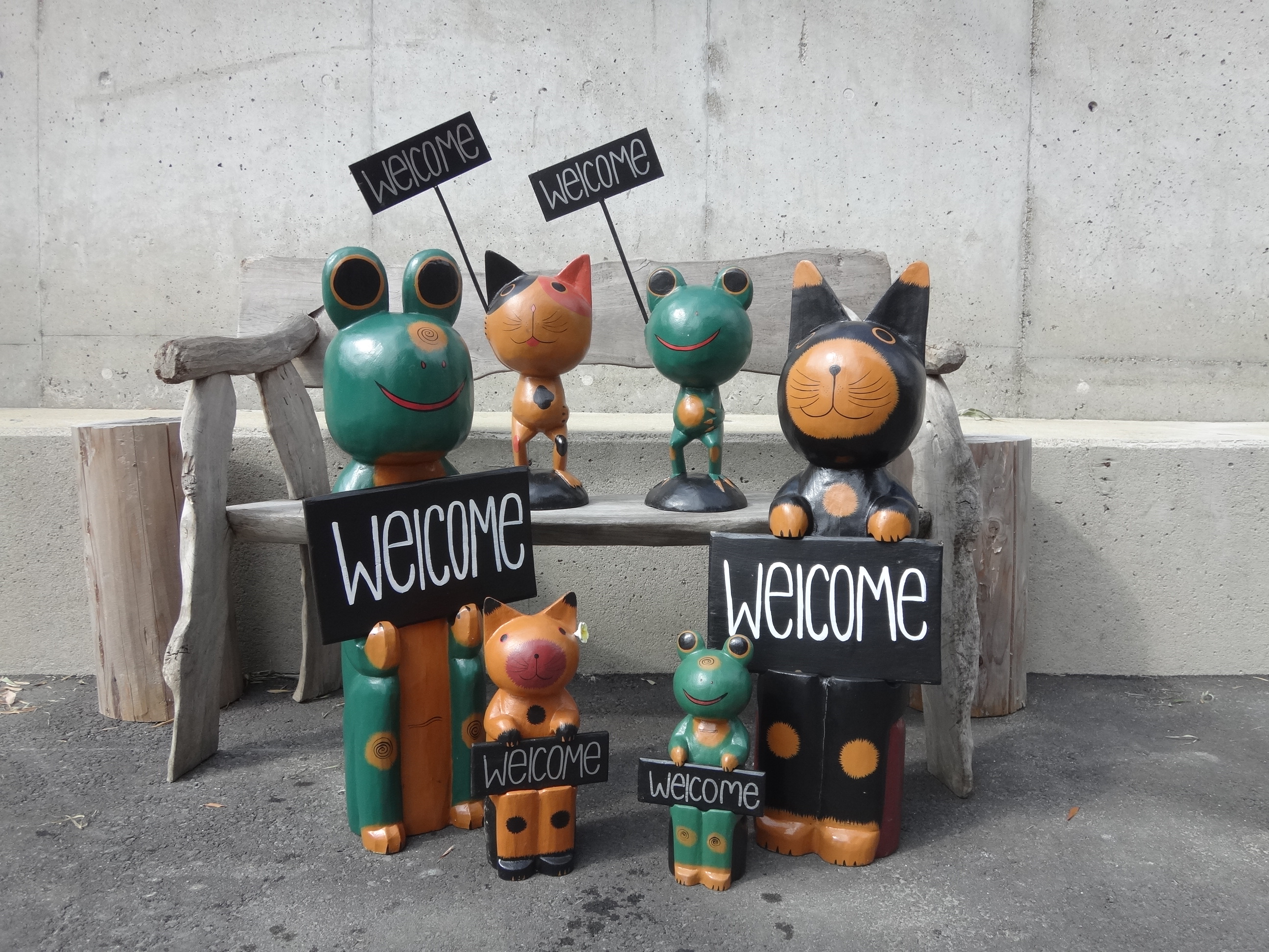 WELCOMEプレートを持った木彫りのカエルとネコです。