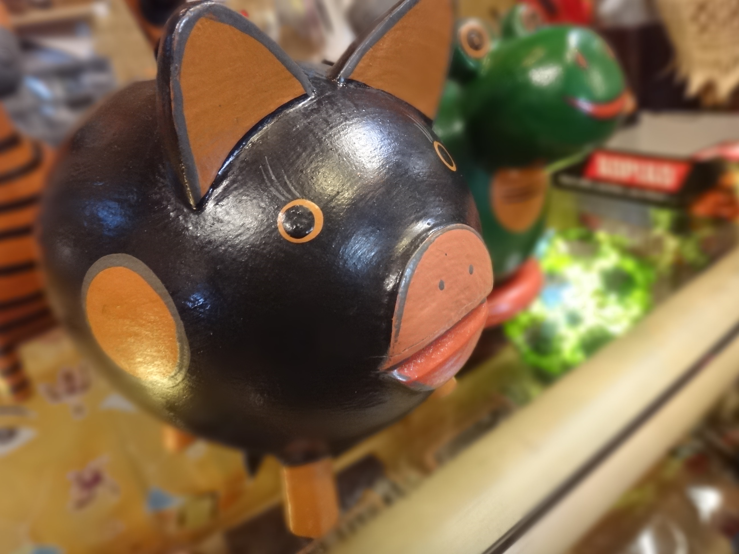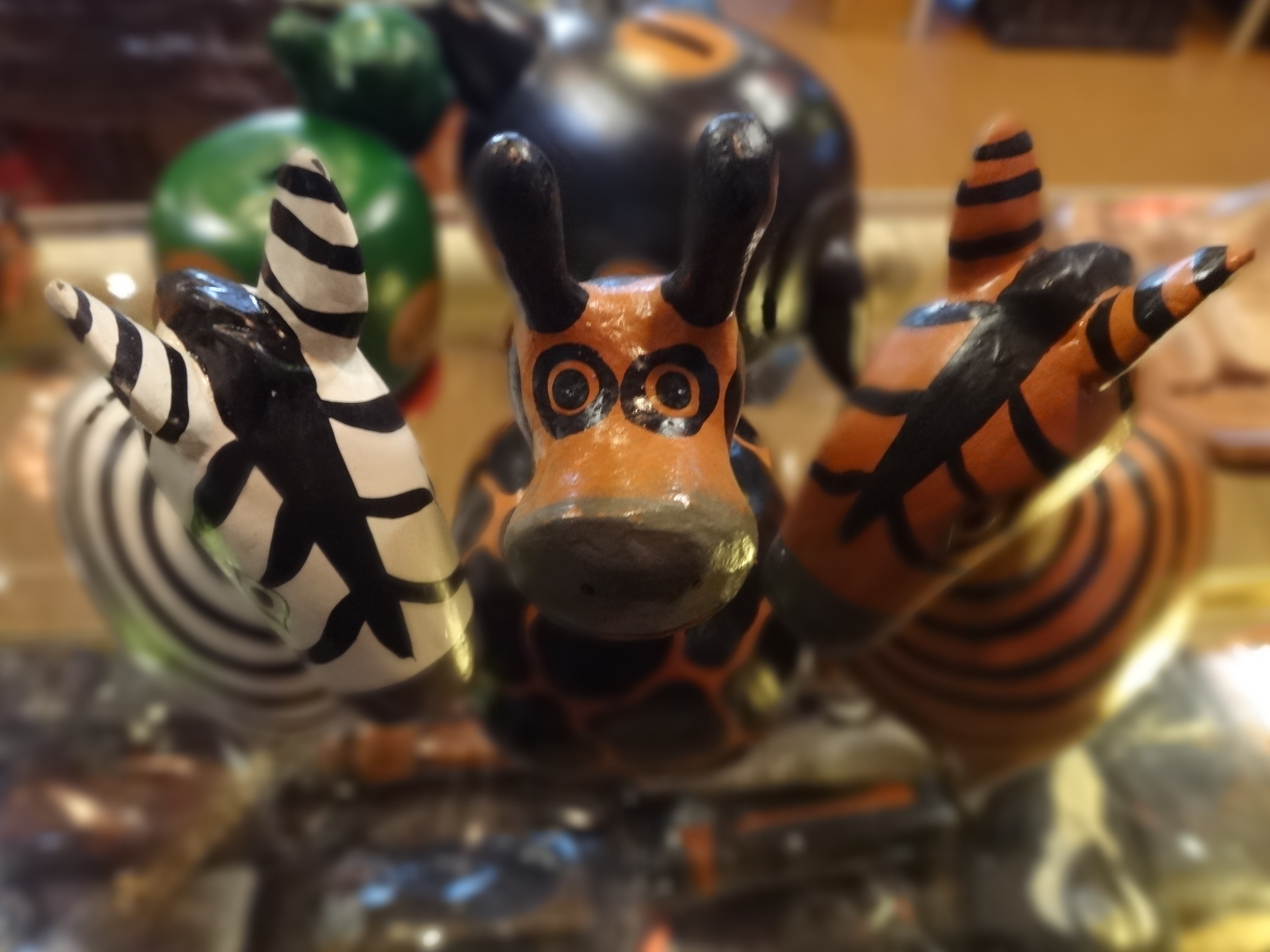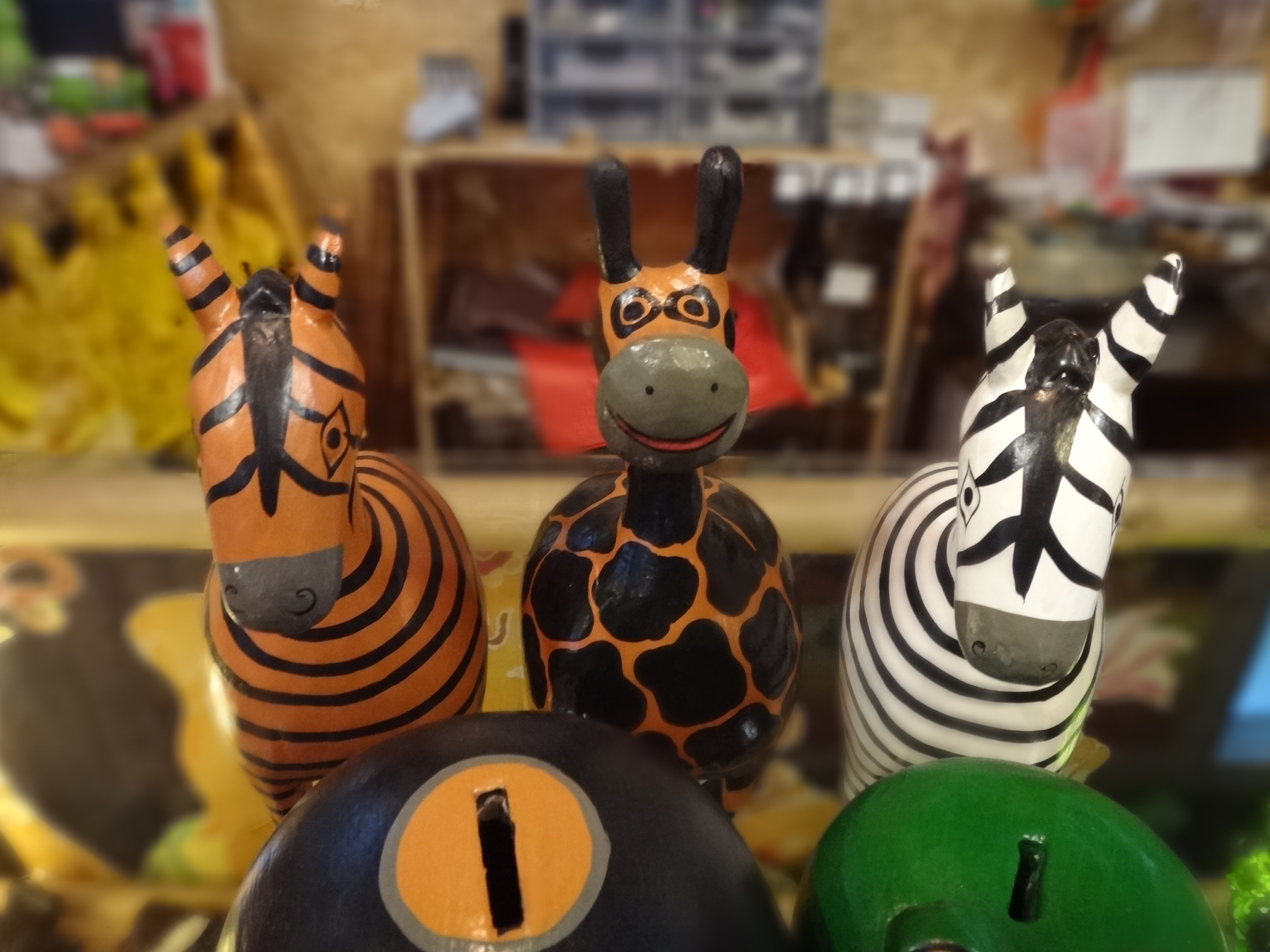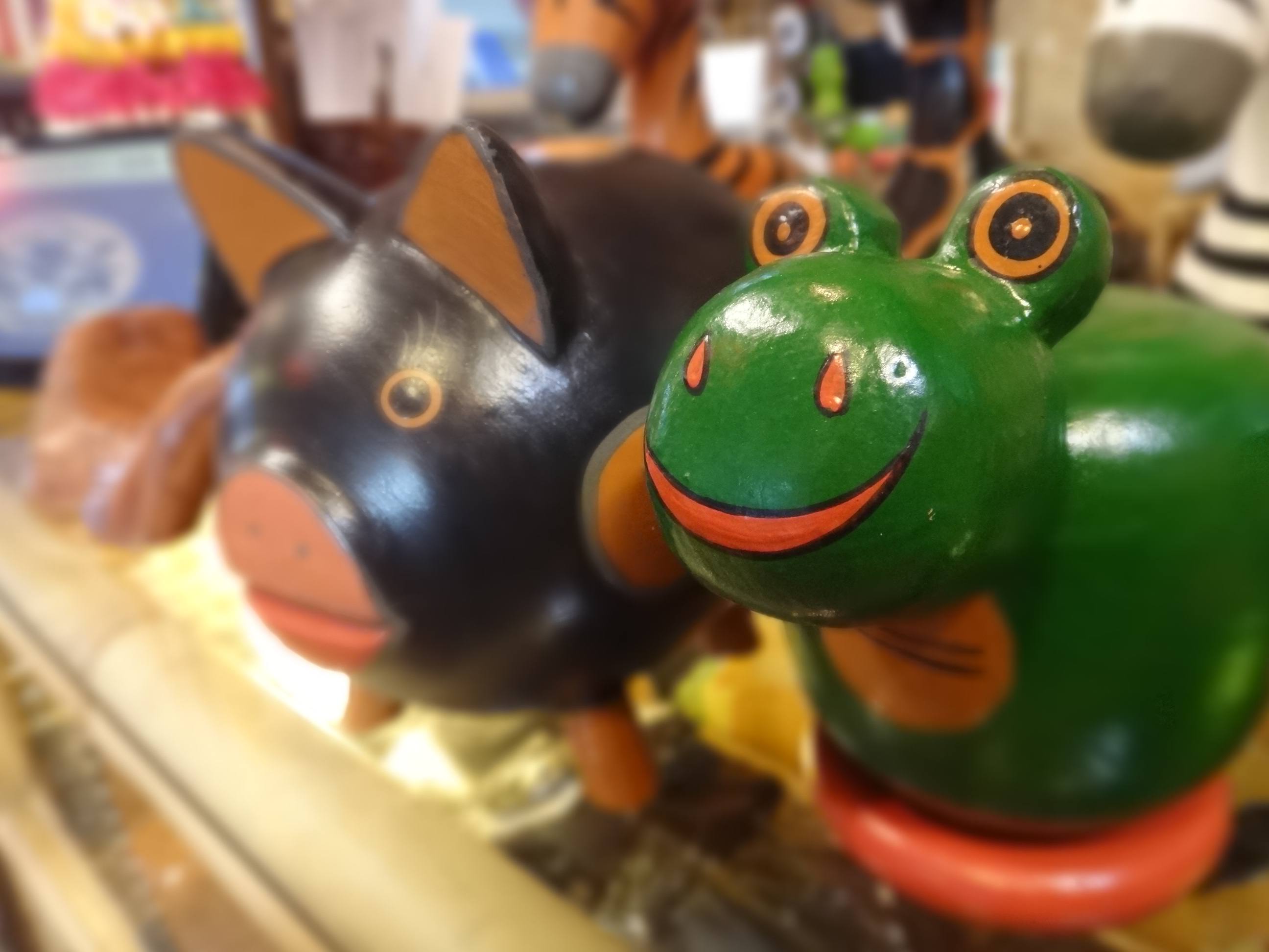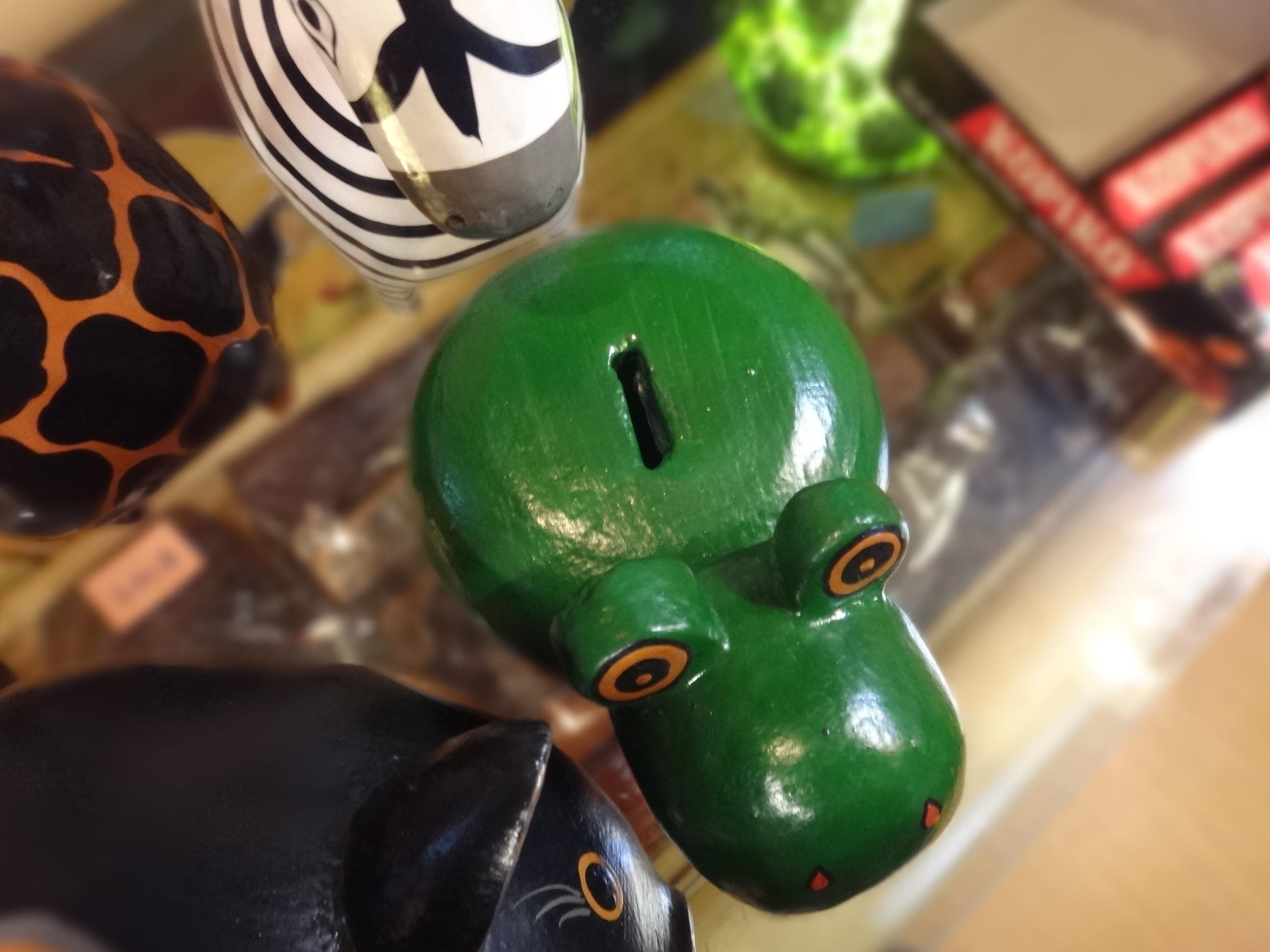 ブタやらカエルやらキリン、そしてシマウマたちの木彫りアニマル貯金箱です。